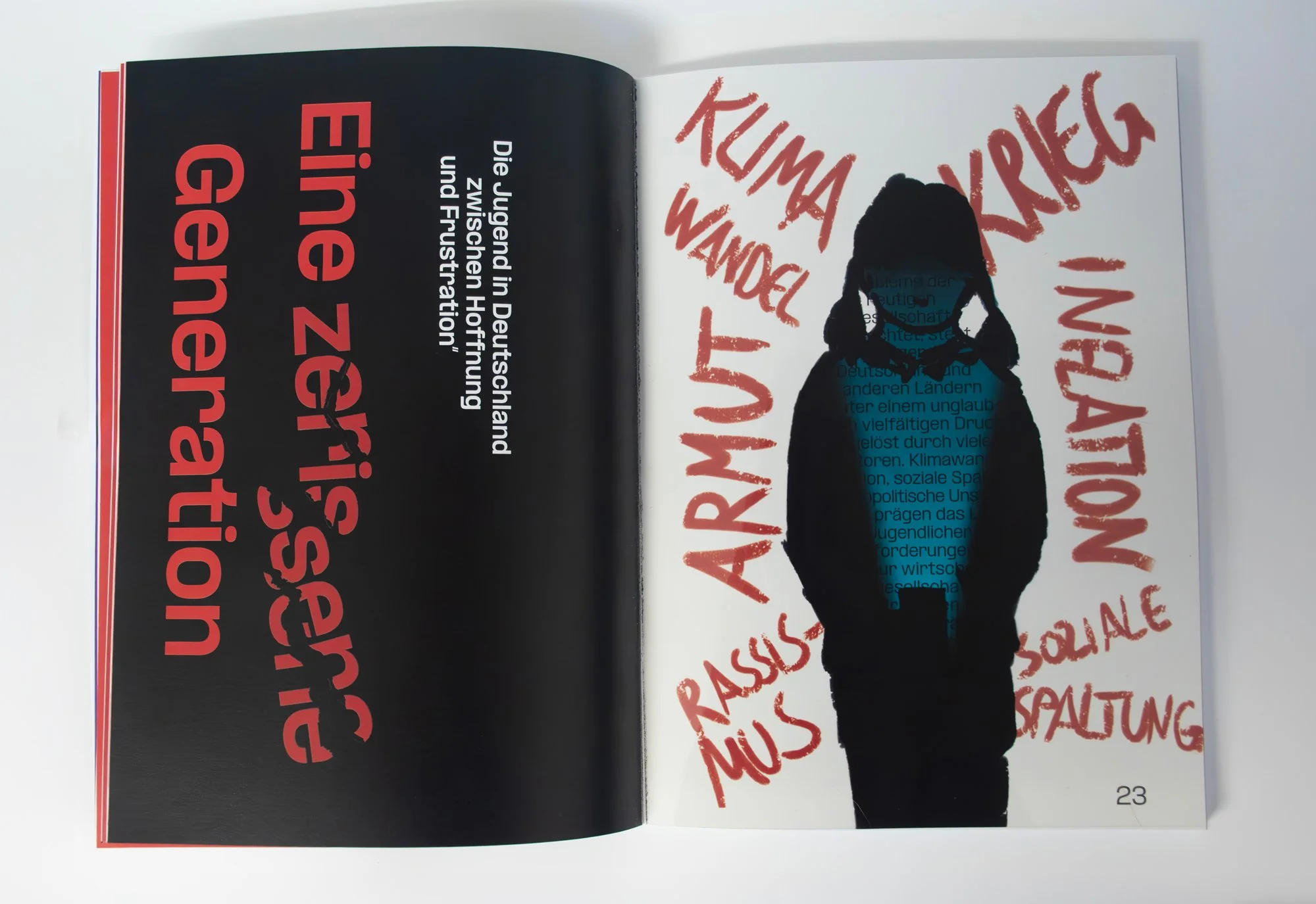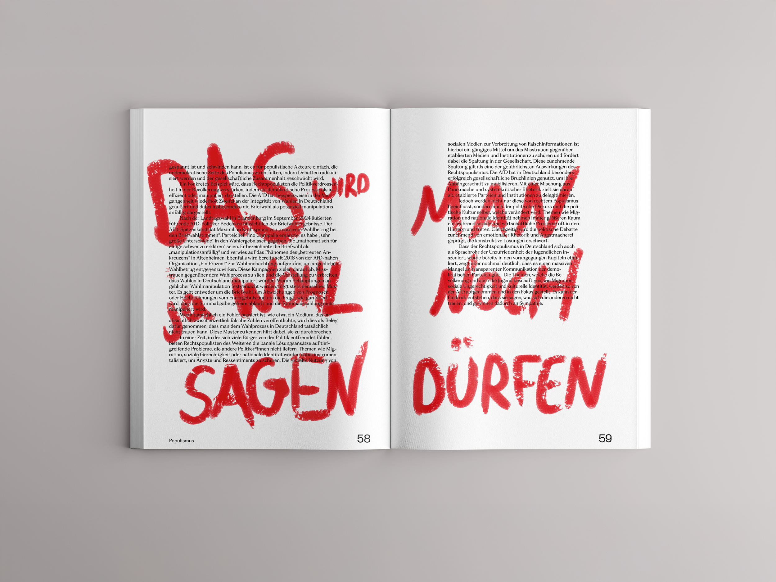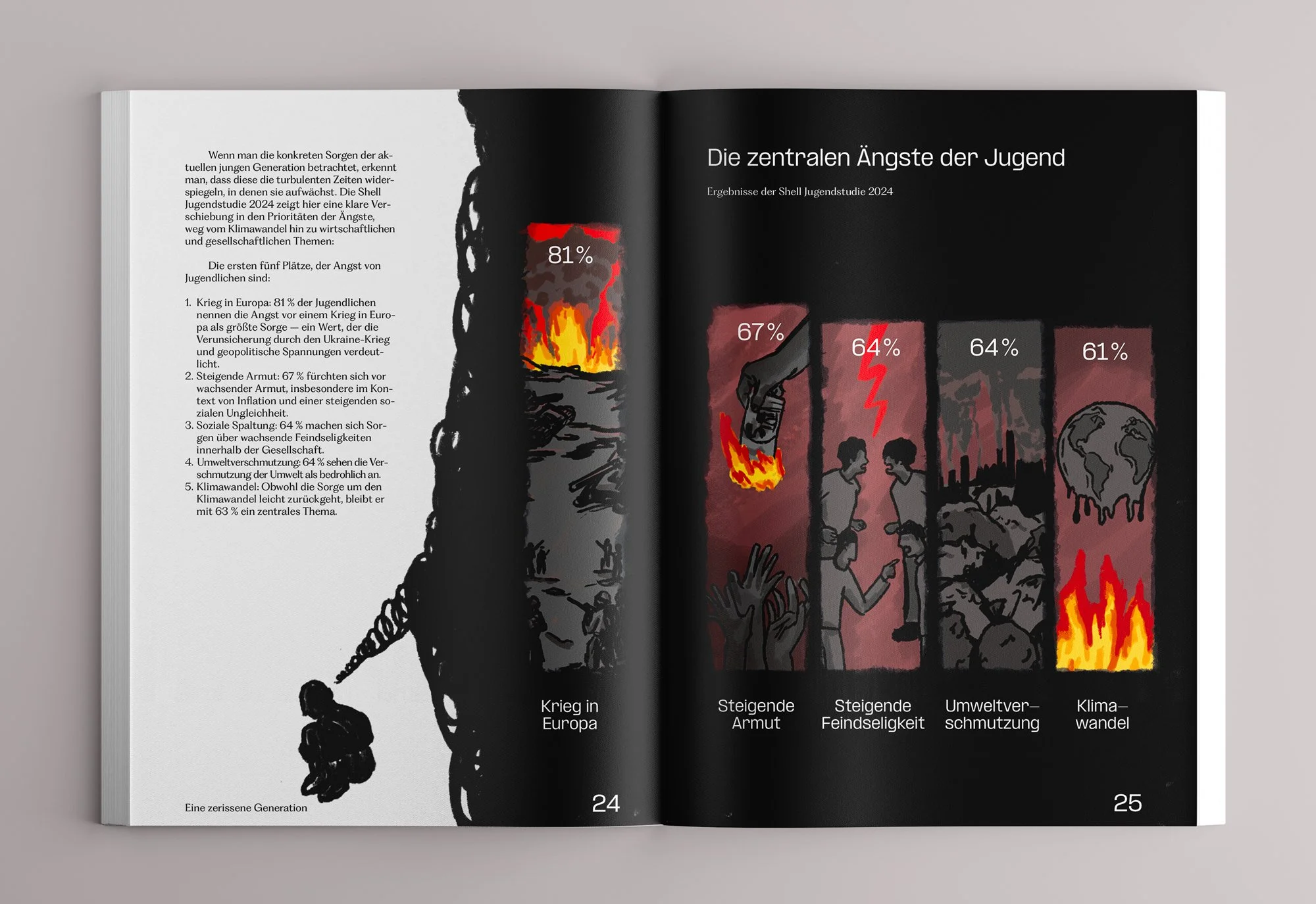 Gestalterisch setze ich auf starke Farben, Illustrationen und eine klare Struktur, die das Lesen erleichtert. Infografiken und typografische Spielereien helfen dabei komplexe Themen anschaulich darzustellen und sorgen immer wieder zum Innehalten im Magazin.