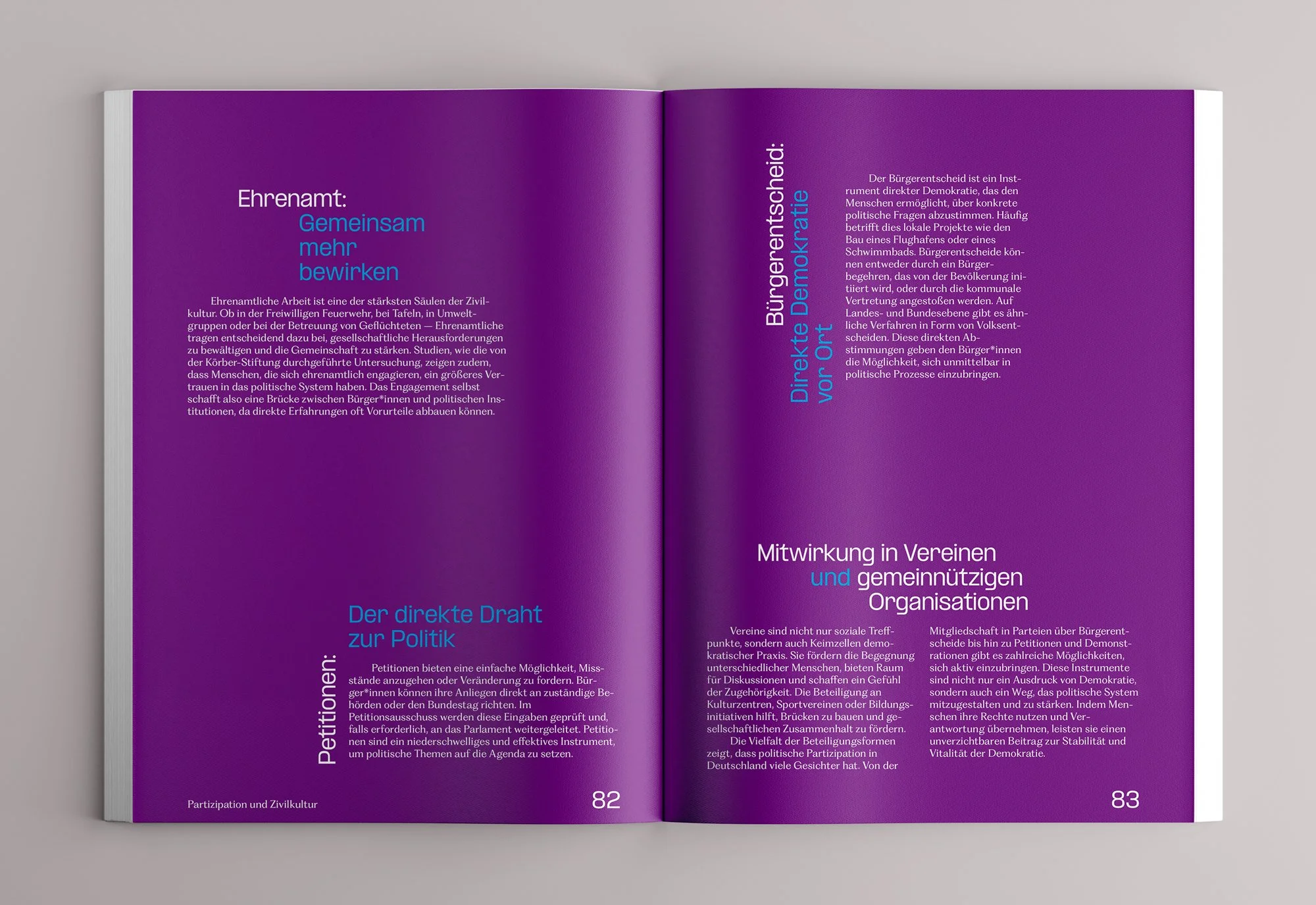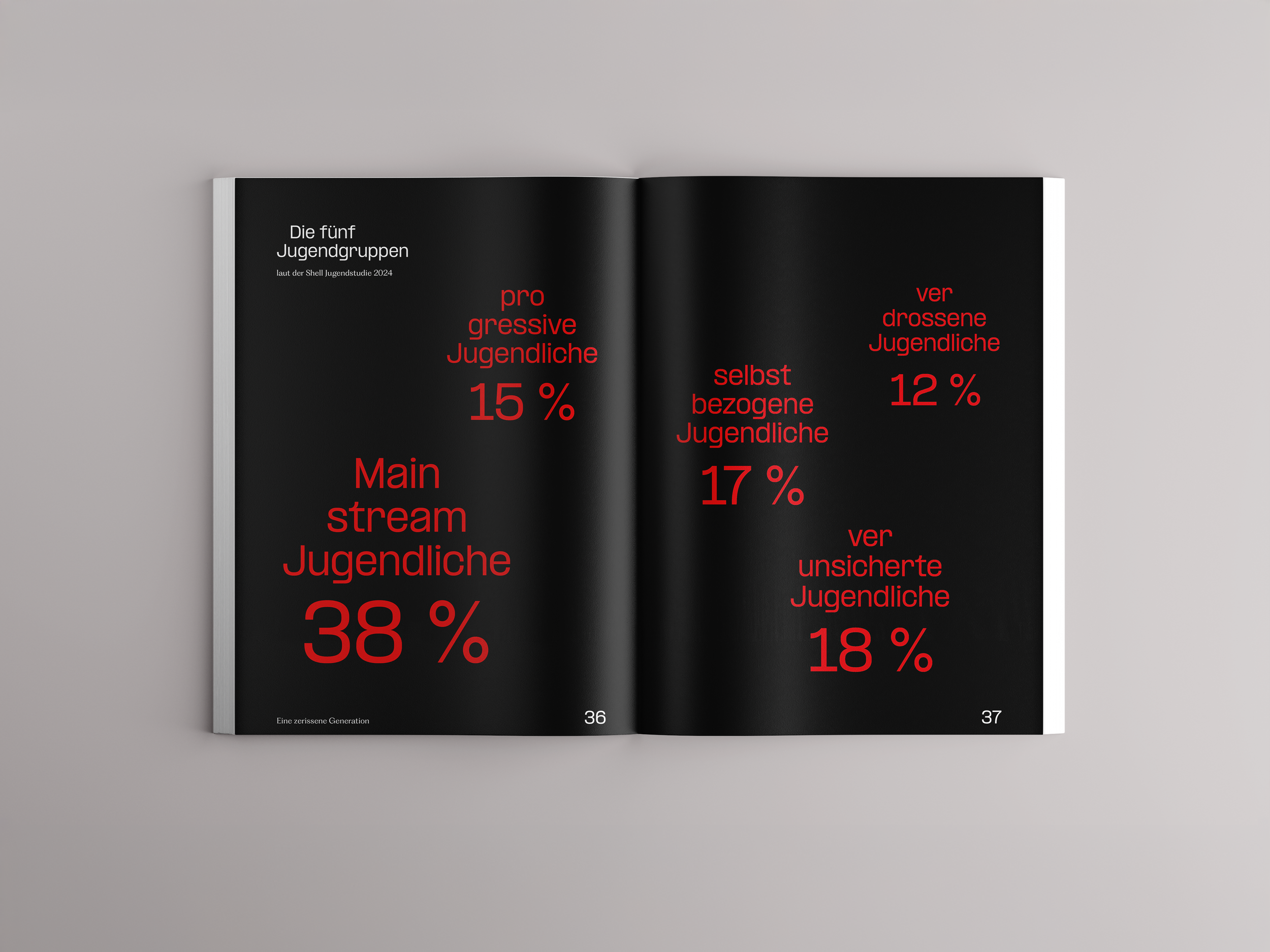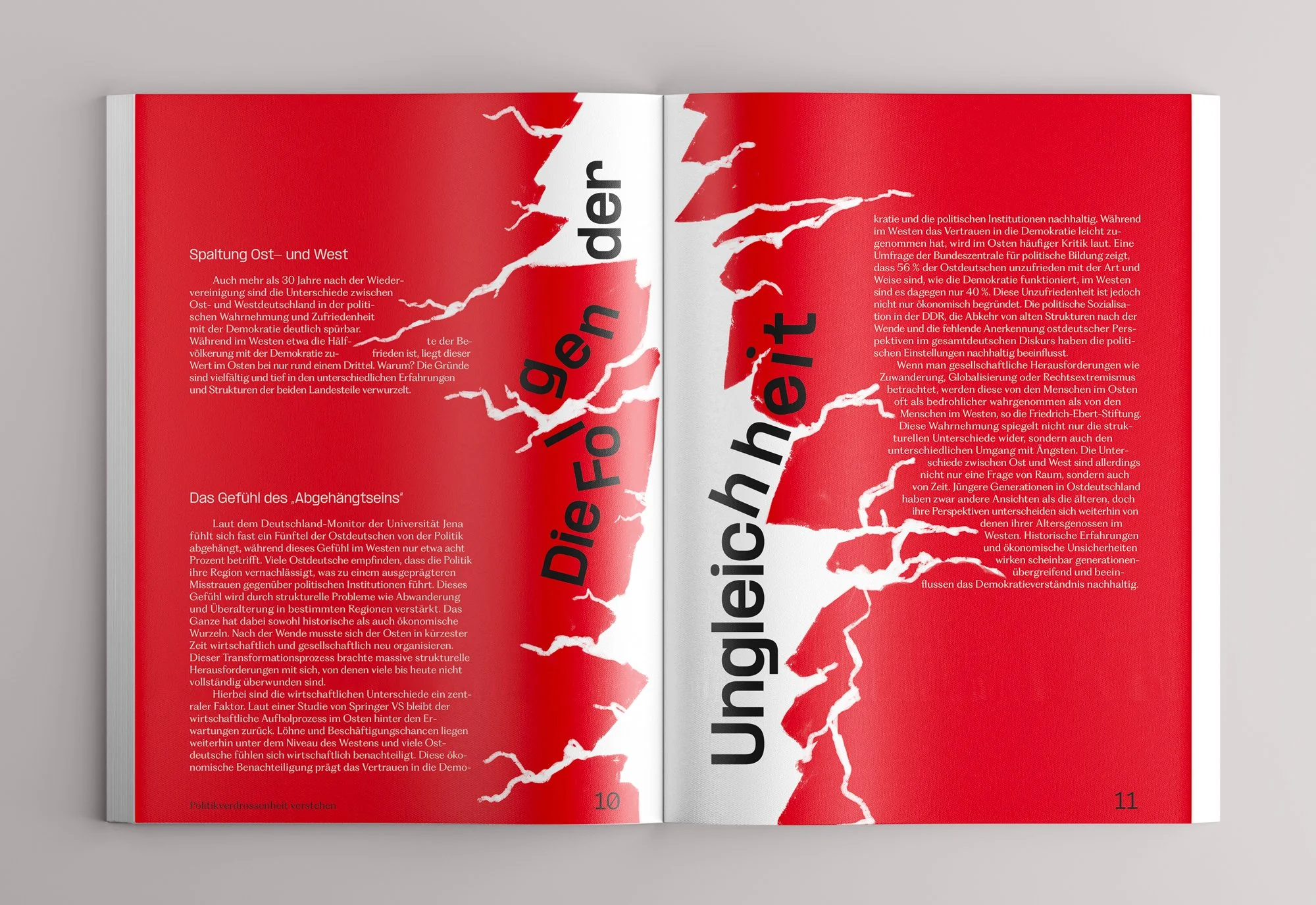 Gestalterisch setze ich auf starke Farben, Illustrationen und eine klare Struktur, die das Lesen erleichtert. Infografiken und typografische Spielereien helfen dabei komplexe Themen anschaulich darzustellen und sorgen immer wieder zum Innehalten im Magazin.