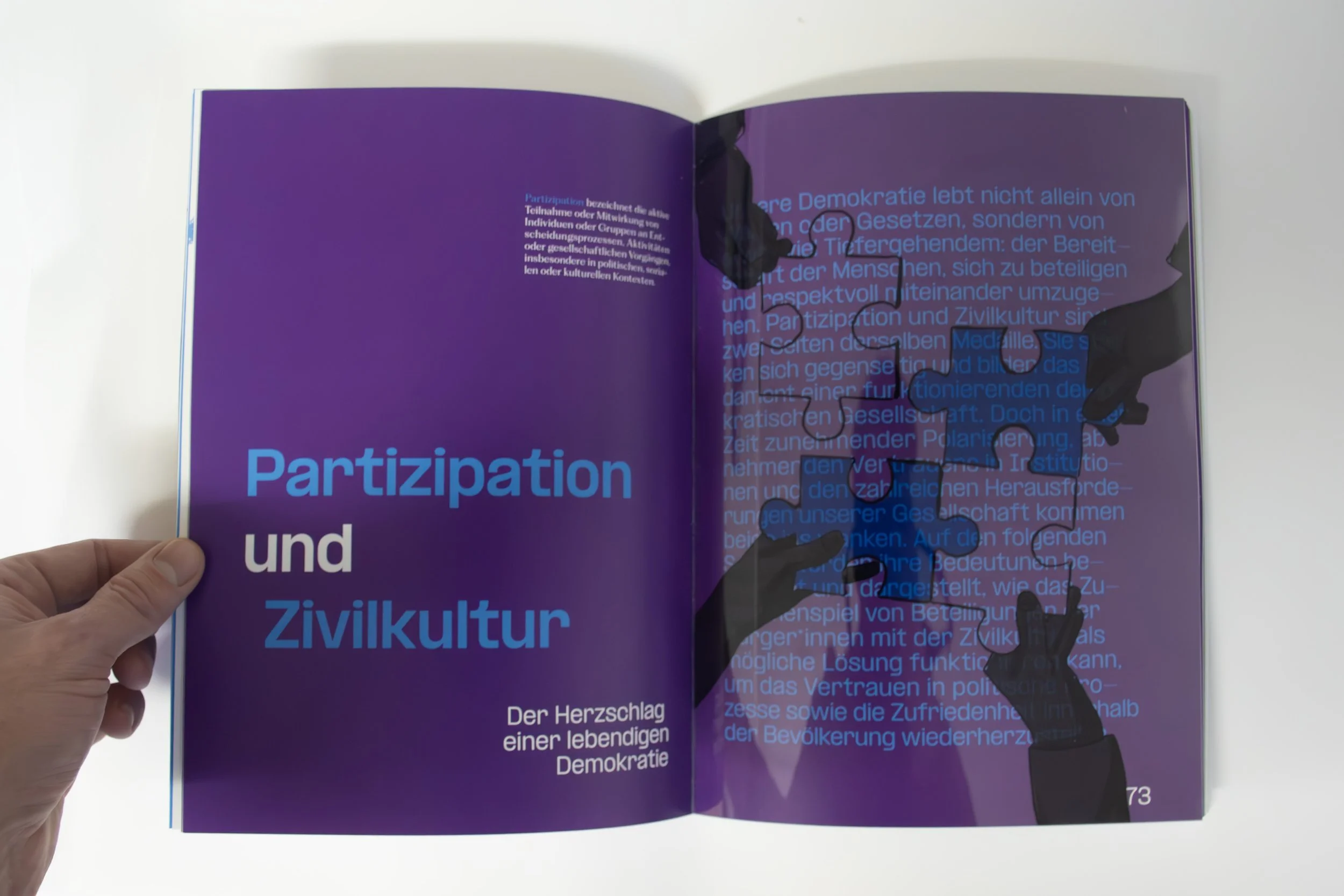 Das Herzstück der Arbeit ist das gestaltete Magazin, welches informieren, zum Nachdenken anregen und vor allem zum Mitmachen motivieren soll. Ergänzt werden die Informationen noch mit Praxisbeispielen aus den Städten Mannheim und Heidelberg, welche zeigen, was für Formen der Bürgerbeteiligung hier möglich sind.