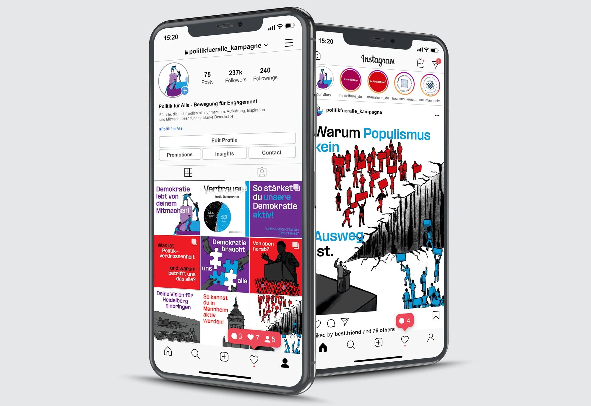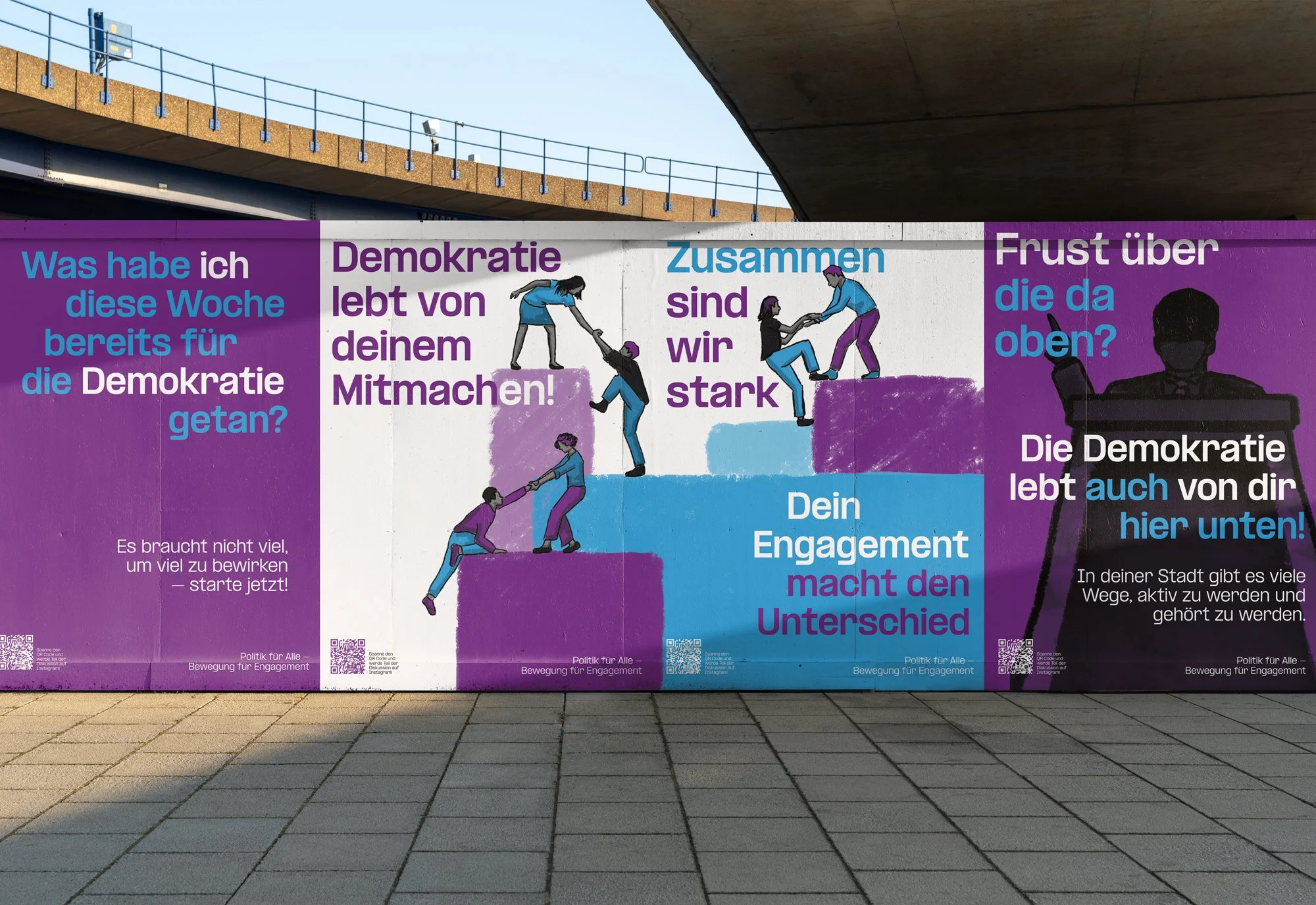 Zusätzlich wurde eine transmediale Kampagne entwickelt, die Social Media und Plakate nutzt, um das Thema noch sichtbarer zu machen. Hier wird sowohl zur aktiven Mitgestaltung aufgerufen als auch zu aktuellen Themen kurz und knapp informiert. Die Botschaft der Arbeit ist klar: Politik geht uns alle an – und jede*r kann etwas beitragen!